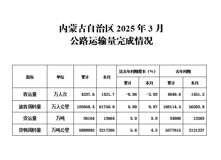 内蒙古自治区2025年1-3月公路运输量完成情况
