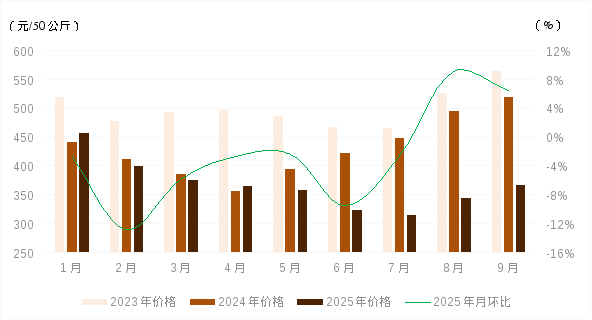 1-9月份,我区鸡蛋出场价格先降后升。今年以来,国内蛋鸡存栏持续高位,养殖端在成本可控以及对秋季鸡蛋行情预期回暖等影响下淘汰意愿偏弱,鸡蛋市场存在一定供应压力。相比之下,鸡蛋市场需求增长相对有限。其中,1月份在“元旦”、“春节”等节日效应提振下,鸡蛋市场需求集中释放;2-3月份,食品加工企业减少对鸡蛋的采购量,且居民家庭以消化存货为主。4-5月份,随着气温逐步回升及“五一”“端午”节日临近,鸡蛋市场需求小幅回升;6-7月份,节日提振效应消退,鸡蛋市场需求回归常态。8-9月份,先后在学校开学、节前备货等提振下,鸡蛋市场需求走强。在供需、成本等因素作用下,1-7月份我区鸡蛋出场价格呈逐步下降走势;8-9月份价格触底反弹,养殖端盈利状况好转。9月份我区鸡蛋平均出场价格为366.66/50公斤,与202412月份相比累计下降22.07%