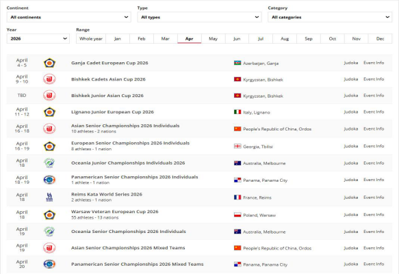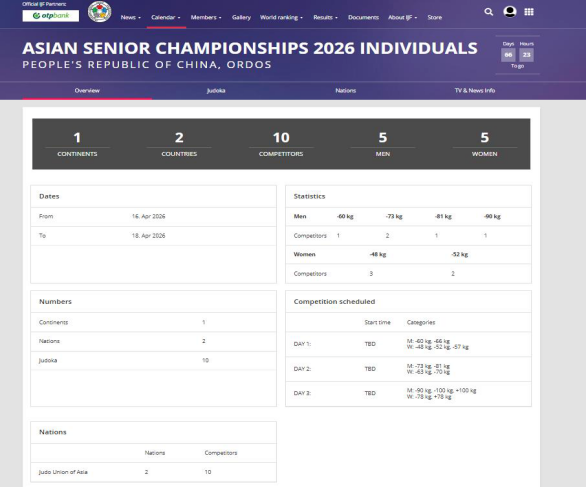 近日,亚洲柔道联合会正式通告,2026年亚洲柔道锦标赛(含个人赛及混合团体赛)定于2026年4月16日至19日在内蒙古自治区鄂尔多斯市举行。