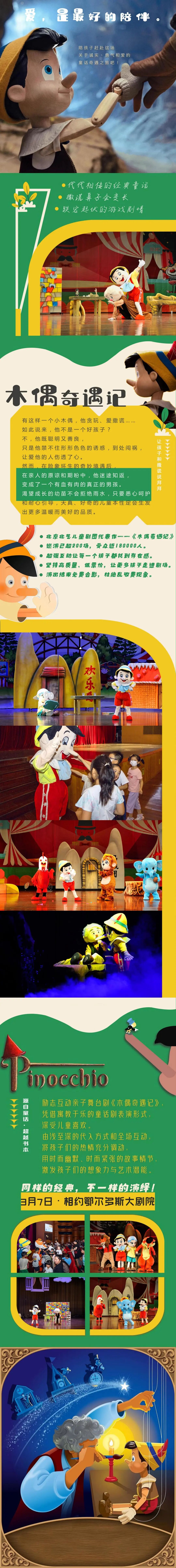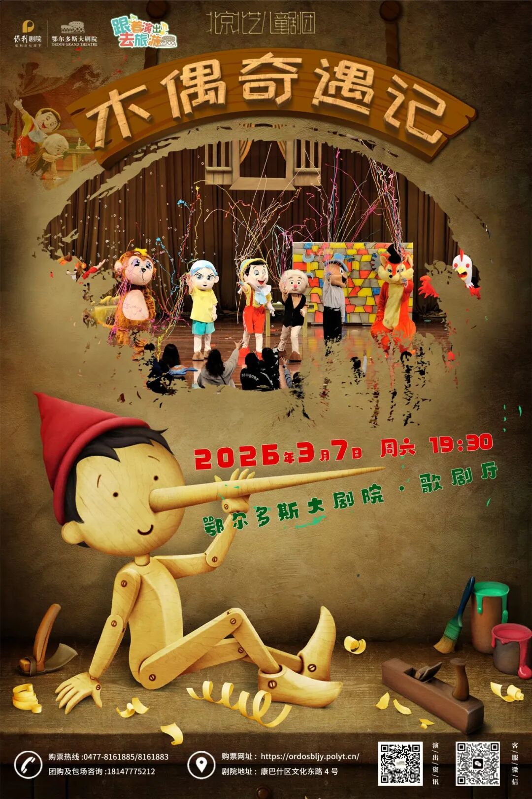 每个孩子的童年里都住着一个长鼻子的小木偶他贪玩、爱撒谎却在一次次冒险里学会了诚实与勇敢这个春天走进鄂尔多斯大剧院带娃开启一场关于爱与成长的童话之旅!儿童剧《木偶奇遇记》  演出时间 | Time2026年3月7日(周六) 19:30演出地点 | Venue鄂尔多斯大剧院·歌剧厅