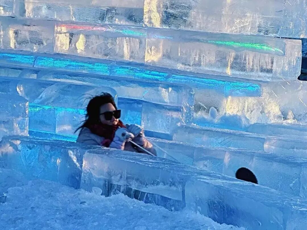 你可以穿梭在精致剔透的冰雕建筑之间