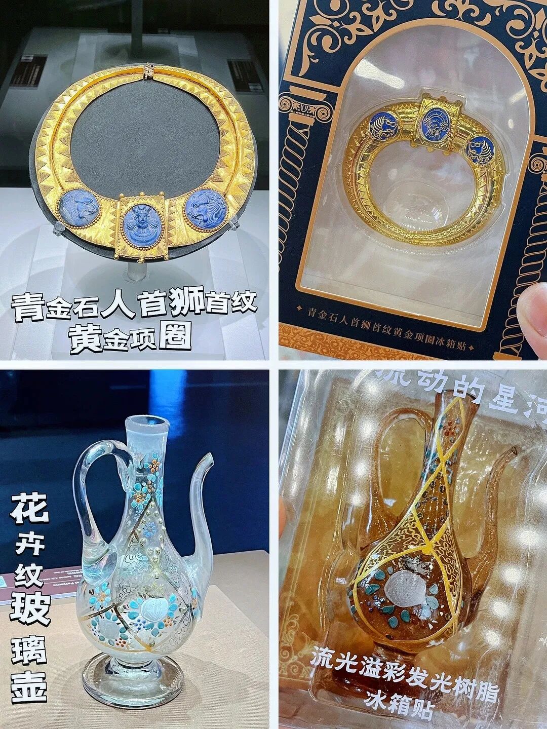青金石人首狮首纹黄金项圈:用展柜的线条做框式构图,突出黄金与青金石的华贵质感,细节控狂喜!