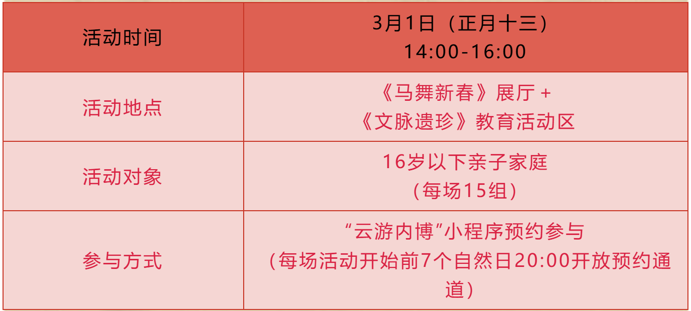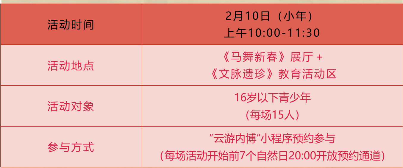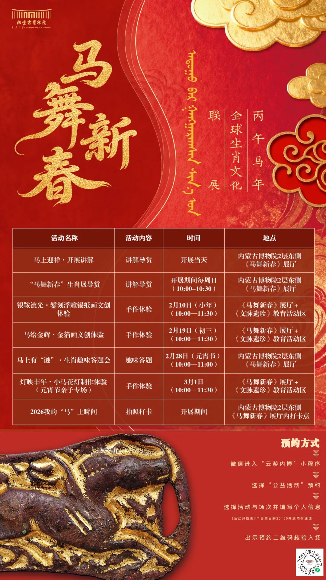 新春将至,年味渐浓!内蒙古博物院重磅推出“马舞新春——丙午马年全球生肖文化联展”,2月5日-4月5日,一场跨越古今的马文化盛宴即将启幕!打破静态观展局限,我们带来“可感、可触、可创、可思”的七大主题活动,让马文化从展柜中走出,融入你的视听触感与创意瞬间,邀你共赴一场“见展、见物、见技艺、见精神”的文化之约~