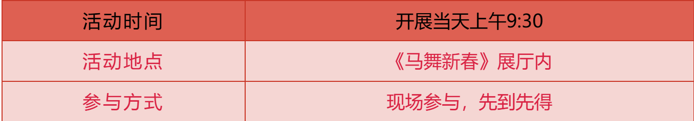 开展当日,专属讲解员将深度揭秘展览设计巧思,带领观众穿行古今马文化长廊,沉浸式感受马年新春的浓厚底蕴。到场观众可领取马元素限定挂件,一键开启新春好运序章,让福气“马上”降临!