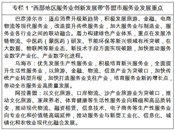 (一)西部地区服务业创新发展翼。依托沿黄河、沿交通干线区域的区位、产业、资源、交通等优势,以呼和浩特市为核心,以呼包鄂乌为发展极,沿线串联巴彦淖尔市、乌海市、阿拉善盟等区域性节点城市,构建呼包鄂乌高端服务产品向西外溢的主要廊道,着力发展现代金融、科技服务、信息服务、养老服务等对外辐射能力较强的服务产业,增强高端服务业集聚能力,形成新产品、新技术、新业态、新模式的创新高地。以系统推进改革创新为重点,整合科技、资本、技术和资源优势,促进制造业数字化、智能化改造,推动制造业服务化进程;加快推进服务业创新发展,促进服务业跨区域、跨行业融合,着力提升生产性服务业和生活性服务业的效率与品质。重点聚焦服务业新兴领域,着力打造服务业创新发展载体,强化技术、信息、数据、人才等要素支撑,完善有利于服务业创新发展的制度环境,构建有利于服务业创新发展的生态圈,增强服务业发展新动能,推动服务经济高质量发展。鼓励巴彦淖尔市、乌海市和阿拉善盟发挥各自优势,主动接受呼包鄂和周边大中城市辐射带动,加快物流、信息、旅游、健康、养老、家政等服务业创新发展,形成各具特色的服务产业体系。