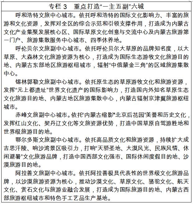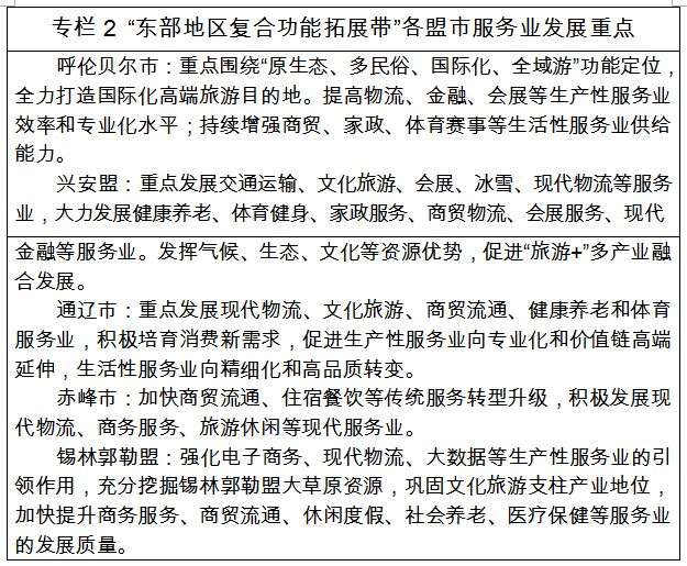 (二)东部地区复合型功能拓展翼。坚持规划引领、功能完善、复合发展的思路,以呼和浩特市为核心,以呼包鄂乌为发展极,向呼伦贝尔市、兴安盟、通辽市、赤峰市、锡林郭勒盟五盟市辐射延展,带动东部地区五盟市改造提升传统服务业,培育发展现代服务业。以生活性服务业为重点,着力补足东部地区服务业发展短板和不足。进一步突出服务功能完善、消费升级导向和新业态新模式培育,推进产业转型升级,推动各盟市向现代化、复合型功能服务城市转变。主动接受京津冀、环渤海地区辐射带动,强化产业对接,加快推进服务产品、技术、业态和模式创新,积极发展健康养老、现代物流、电子商务、现代金融等新兴服务业,大力发展观光旅游、休闲度假、文化体验为主的现代旅游业,建设全区具有活力的服务业复合型功能拓展翼。鼓励呼伦贝尔市、兴安盟、通辽市、赤峰市、锡林郭勒盟立足自身优势,主动接受“一极”辐射,围绕产业定位,引进龙头企业和高端品牌,加快特色产业聚集,培育形成各具特色的区域性商贸流通中心、区域性休闲度假和文化旅游中心、区域性康养服务中心等,构筑服务业发展新高地。