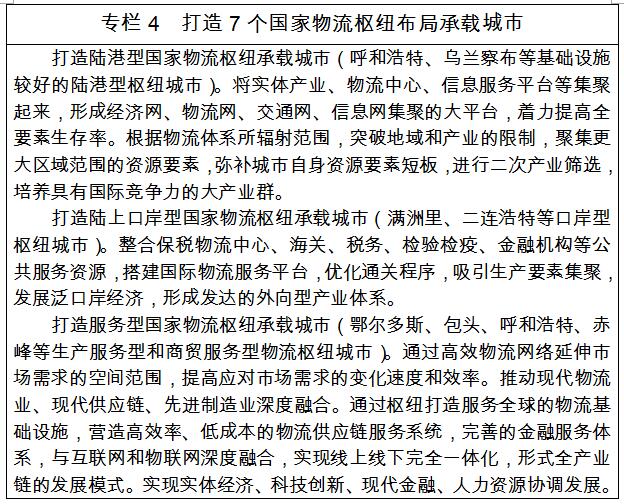 (一)突出呼和浩特市核心地位。围绕呼和浩特市“建设现代化区域性中心城市、打造美丽青城·草原都市”总目标,进一步增强服务功能、扩大辐射半径,引领带动周边区域服务业发展,形成“核心引领、功能互补、错位协同”的发展格局。支持呼和浩特市重点打造“四个中心”(区域性科技创新中心、交通物流中心、消费中心、休闲度假中心),推进国家级文化和旅游消费试点城市、国家旅游休闲城市、中国草原文化核心区和文化强市建设。支持呼和浩特市发展经济,提升相关服务业发展质量。强化高端服务功能和首府经济导向,充分发挥服务业的核心功能和中心城区综合性服务功能,把呼和浩特市建设成为服务全区、辐射西北、面向俄蒙的生产和生活服务集聚中心,形成有序分工、协调互动的发展格局。以呼和浩特国家级服务业综合改革试点为契机,紧紧抓住产业培育和集聚区建设两大“牛鼻子”,大力培育壮大数字经济,鼓励服务业业态和模式创新,推动服务外包、医养结合、远程医疗等新业态加快发展,引导平台经济、共享经济、体验经济等新模式有序发展,加快形成全面创新引领发展、高端服务功能集聚、辐射带动作用明显的高端服务业增长核。