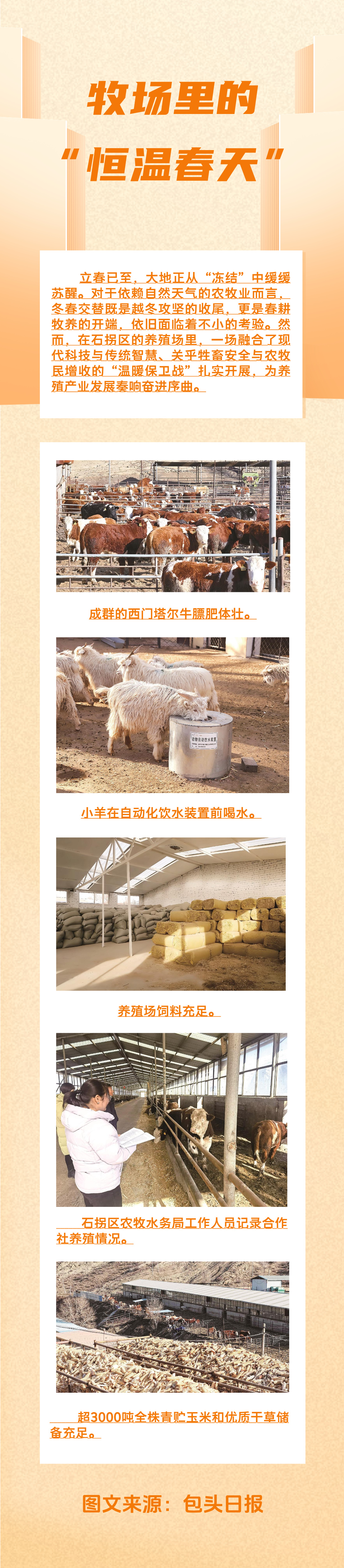 立春已至,大地正从“冻结”中缓缓苏醒。对于依赖自然天气的农牧业而言,冬春交替既是越冬攻坚的收尾,更是春耕牧养的开端,依旧面临着不小的考验。然而,在石拐区的养殖场里,一场融合了现代科技与传统智慧、关乎牲畜安全与农牧民增收的“温暖保卫战”扎实开展,为养殖产业发展奏响奋进序曲。