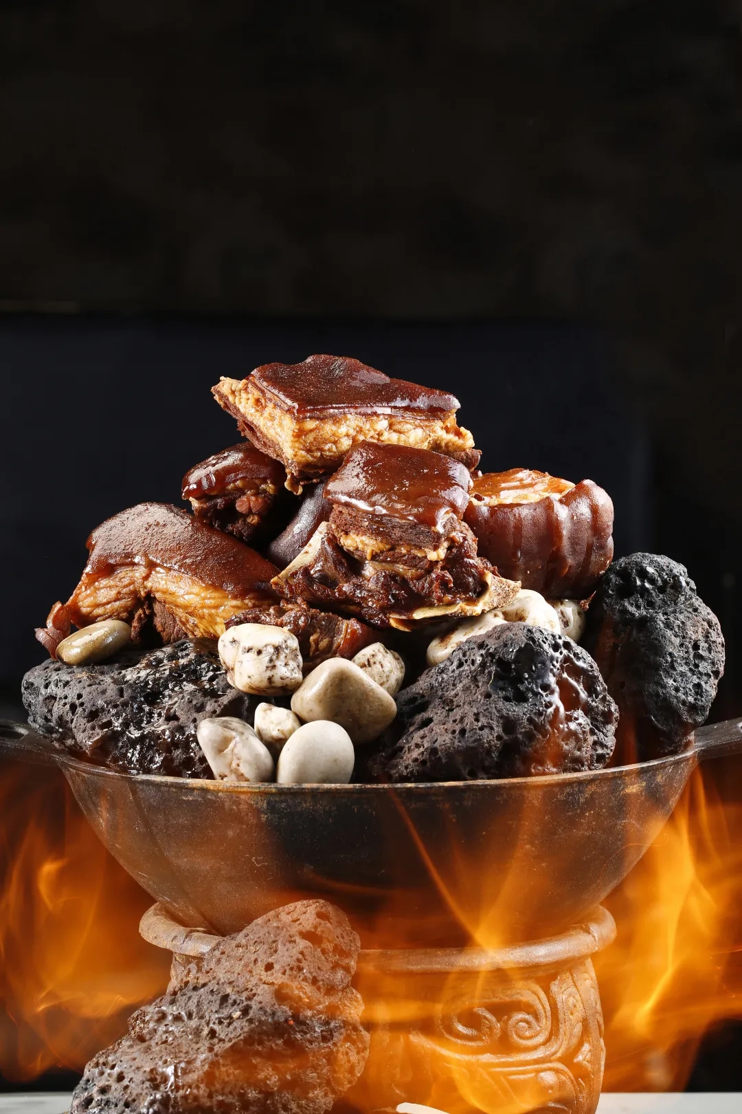 石头烤肉是游牧民族生活中传统的烹饪方法。锡林郭勒石头烤肉,其绝在于天赐火山石与锡林郭勒草原羊肉的共舞同烹。选用锡林郭勒盟苏尼特羊肉(三岁大羊)。