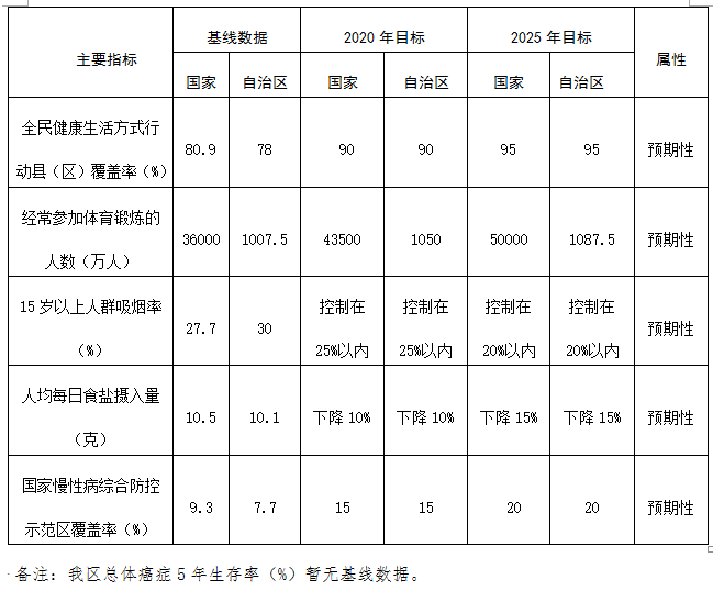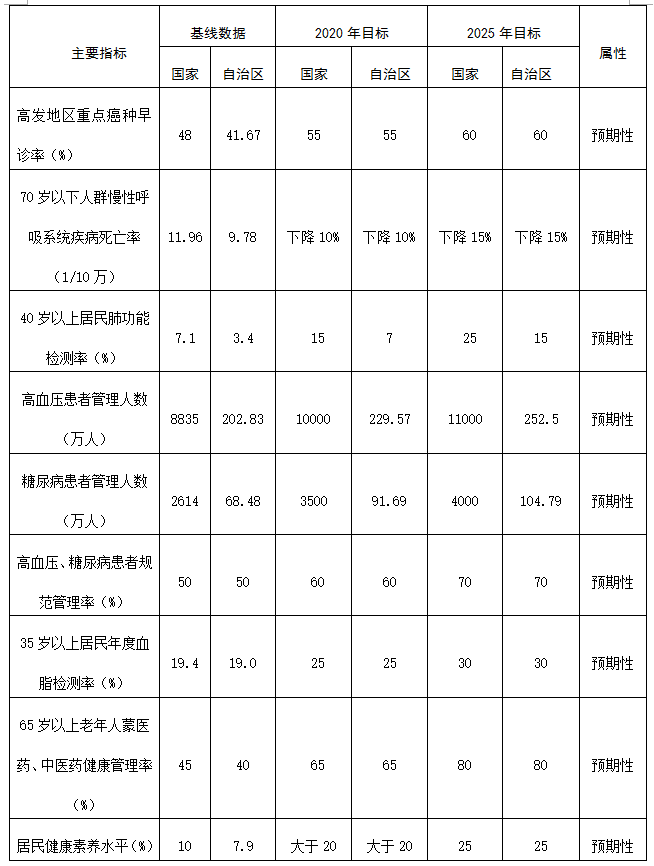 到2020年,“政府主导、部门协作、动员社会(同上)、全民参与”的慢性病防控格局基本形成,防控环境显著改善;到2025年,慢性病危险因素得到有效控制,实现全人群全生命周期健康管理,居民健康期望寿命进一步提高,有效缓解和控制慢性病疾病负担。30-70岁人群因心脑血管疾病、癌症、慢性呼吸系统疾病和糖尿病导致的过早死亡率,力争2020年较2015年降低10%、2025年降低20%。