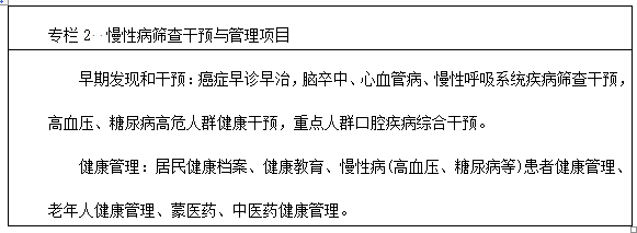 1.促进慢性病早期发现。全面实施35岁以上人群首诊测血压,发现高血压患者和高危人群,及时提供干预指导。社区卫生服务中心和苏木乡镇卫生院逐步提供血糖血脂检测、口腔预防保健、简易肺功能测定和大便隐血检测等服务。逐步将临床可诊断、治疗有手段、群众可接受、政府能负担的疾病筛检技术列为公共卫生措施。在高发地区和高危人群中逐步开展上消化道癌、宫颈癌等有成熟筛查技术的癌症早诊早治工作。加强健康体检规范化管理,健全学生健康体检制度,推广老年人健康体检,推动癌症、脑卒中、冠心病等慢性病的机会性筛查。将口腔健康检查纳入常规体检内容,将肺功能检查和骨密度检测项目纳入40岁以上人群常规体检内容。