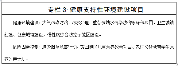 1.建设健康的生产生活环境。推动绿色清洁生产,改善作业环境,严格控制尘毒危害,强化职业病防治,整洁城乡卫生,优化人居环境,加强文化、科教、休闲、健身等公共服务设施建设。建设健康步道、健康公园等运动健身环境,提高各类公共体育设施开放程度和利用率,推动有条件的学校体育场馆设施在课后和节假日对本校师生和公众有序开放,形成覆盖城乡、比较健全的全民健身服务体系,推动全民健身和全民健康深度融合。坚持绿色发展理念,强化环境保护和监管,落实大气、水、土壤污染防治行动计划。建立健全环境与健康监测、调查、风险评估制度,降低环境污染对健康的影响。