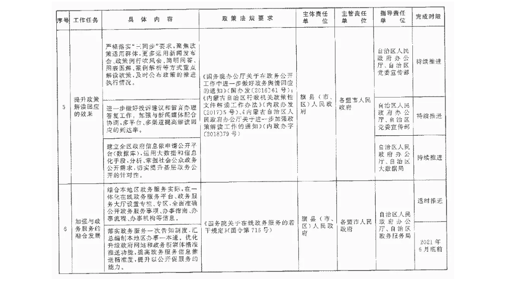 按照自治区政务公开领导小组部署,2020年10月底前,全面完成26个试点领域标准目录编制汇总工作,报盟行署审核后通过政府ld体育中国官方网站向社会公布,同时确保其他各项任务落实到位,有序推进;2020年12月底前,在政务服务大厅、便民服务中心等场所设立标识清楚、方便实用的政务公开专区,提供政府信息查询、信息公开申请、办事咨询答复等服务;2021年3月底前,各旗县市人民政府要制定完善本地区信息管理发布、解读回应、监督考核等方面的制度规范,建立基层政务公开工作规范;2021年底前,各旗县市人民政府要建设标准规范的政务公开平台矩阵,全面提升ld体育中国官方网站解读回应的效果,加强与政务服务的融合发展,完善基层行政决策公众参与机制,同时工作范围向农村牧区和社区延伸。