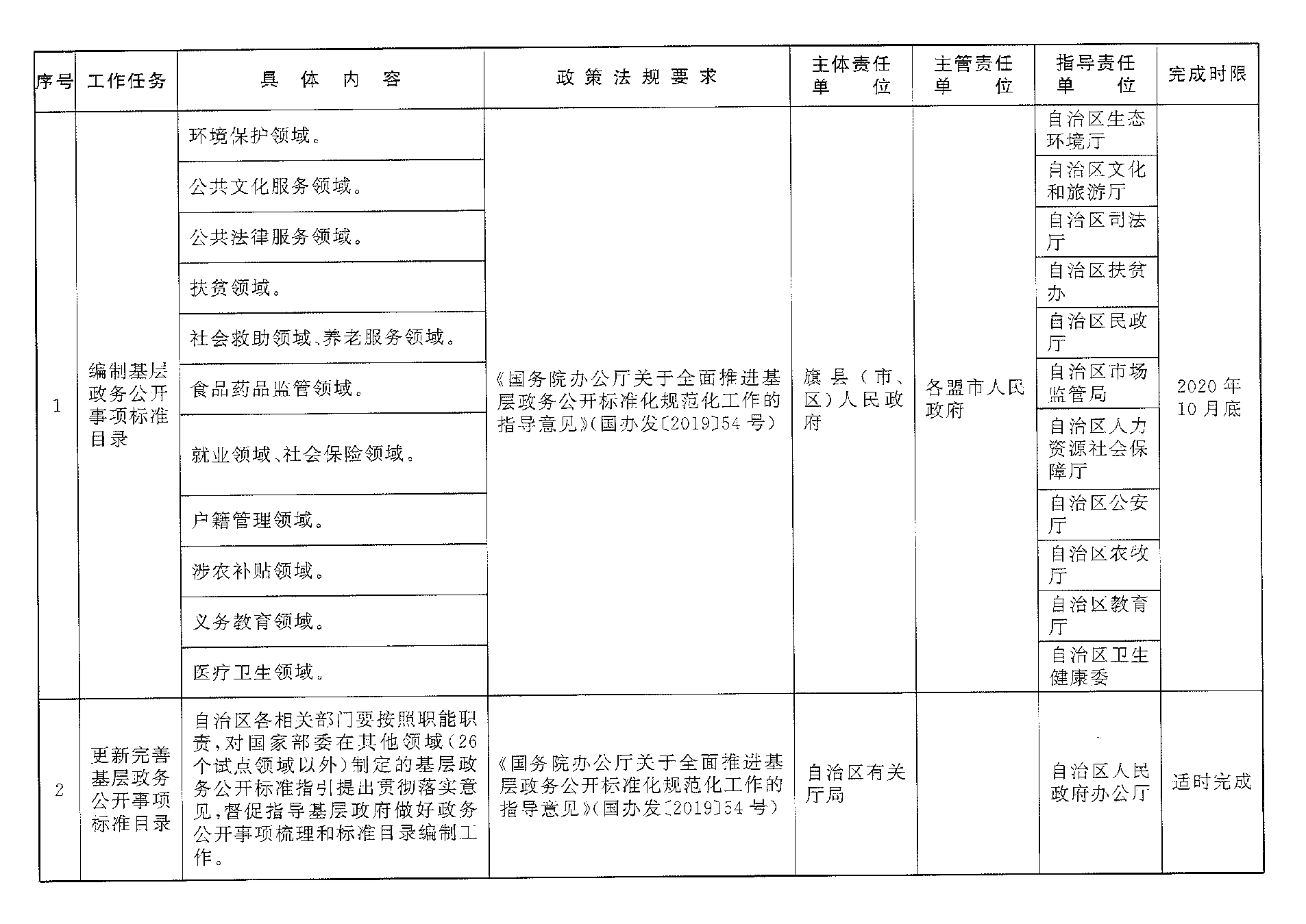 (二)更新完善基层政务公开事项标准目录。自治区各相关部门要按照职能职责,对国家部委在其他领域(26个试点领域以外)制定的基层政务公开标准指引提出贯彻落实意见,督促指导基层政府做好政务公开事项梳理和标准目录编制工作。原则上自治区各相关部门要在国家有关部委印发其他领域新的基层政务公开标准指引后20个工作日内,向基层政府提出更新完善政务公开事项标准目录的建议。各盟行政公署、市人民政府要切实加强对基层政府政务公开事项标准目录编制、更新的监督检查,发现问题要及时提出整改意见并督促整改。基层政府应当建立政务公开事项标准目录动态管理机制,及时调整更新本地区政务公开事项标准目录并向社会公开。