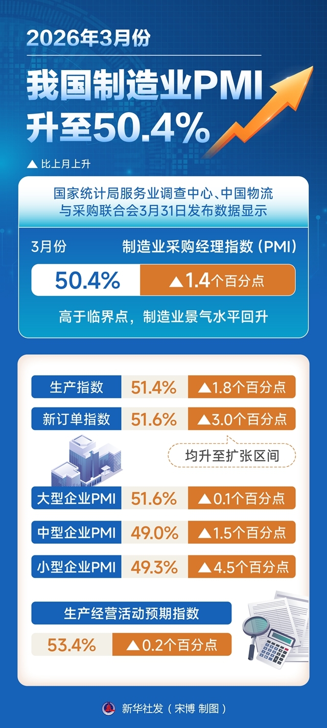 国家统计局服务业调查中心、中国物流与采购联合会3月31日发布数据显示,3月份,制造业采购经理指数(PMI)为50.4%,比上月上升1.4个百分点,高于临界点,制造业景气水平回升。