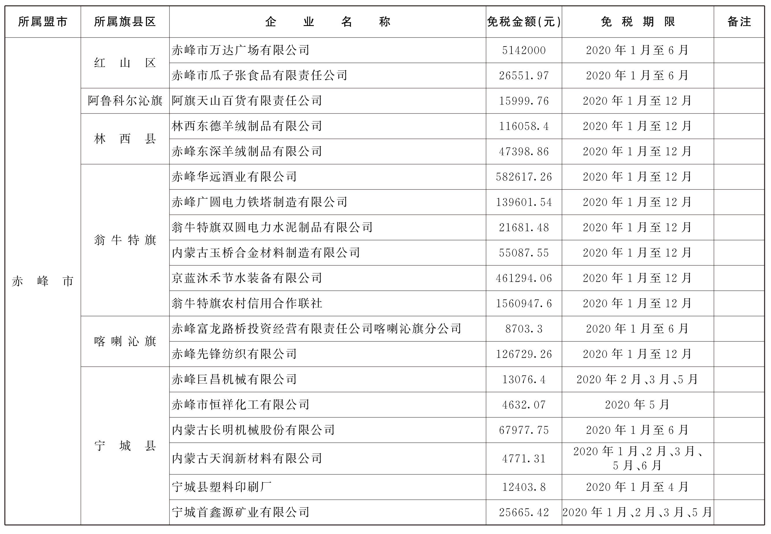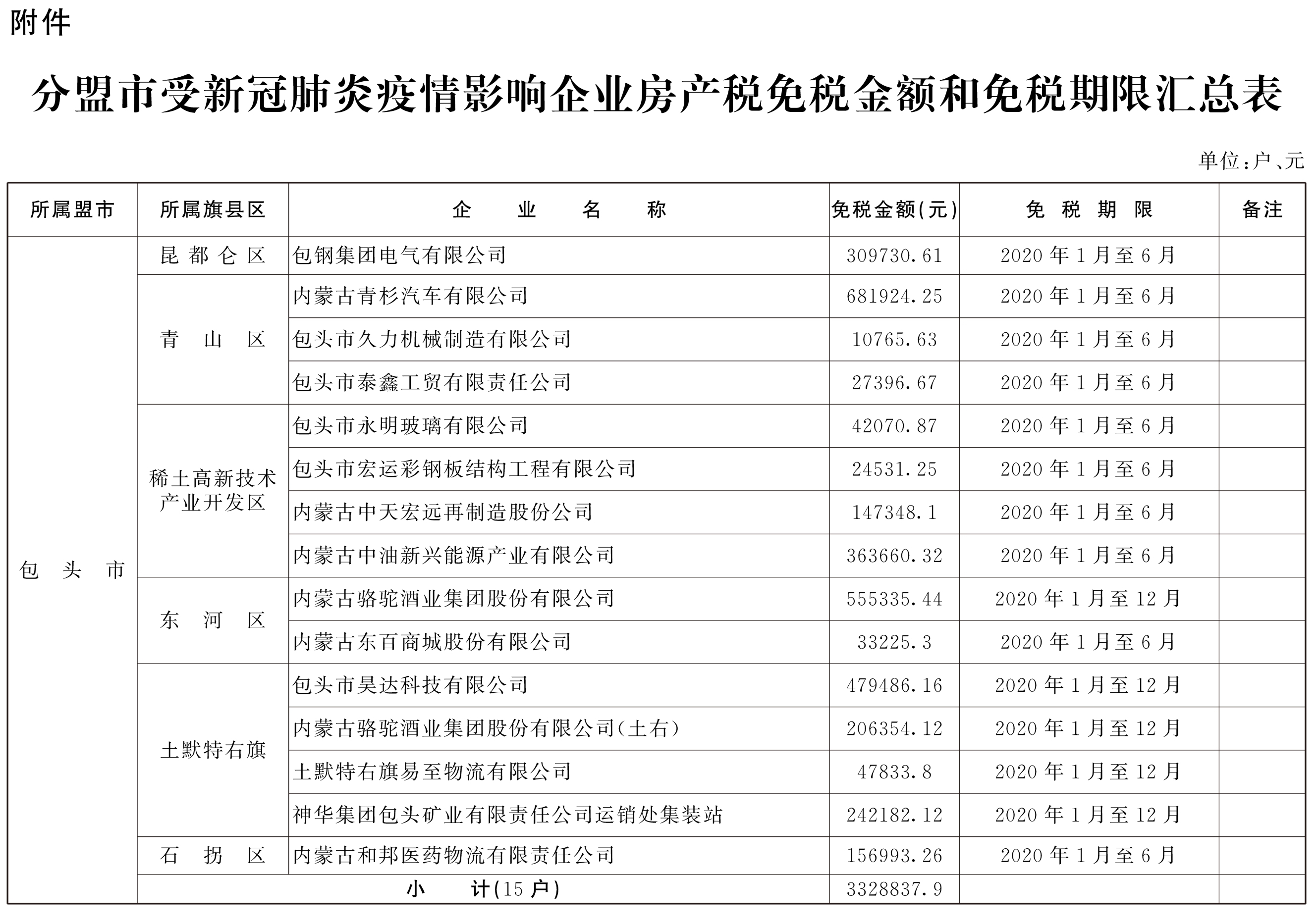一、同意免征包头市、赤峰市、锡林郭勒盟、乌兰察布市65户受新冠肺炎疫情影响企业应纳房产税合计16180507.02元。其中,包头市15户,免税3328837.9元;赤峰市23户,免税8597205.82元;锡林郭勒盟3户,免税20068.02元;乌兰察布市24户,免税4234395.28元。具体免税企业名称、免税金额和免税期限见附件。