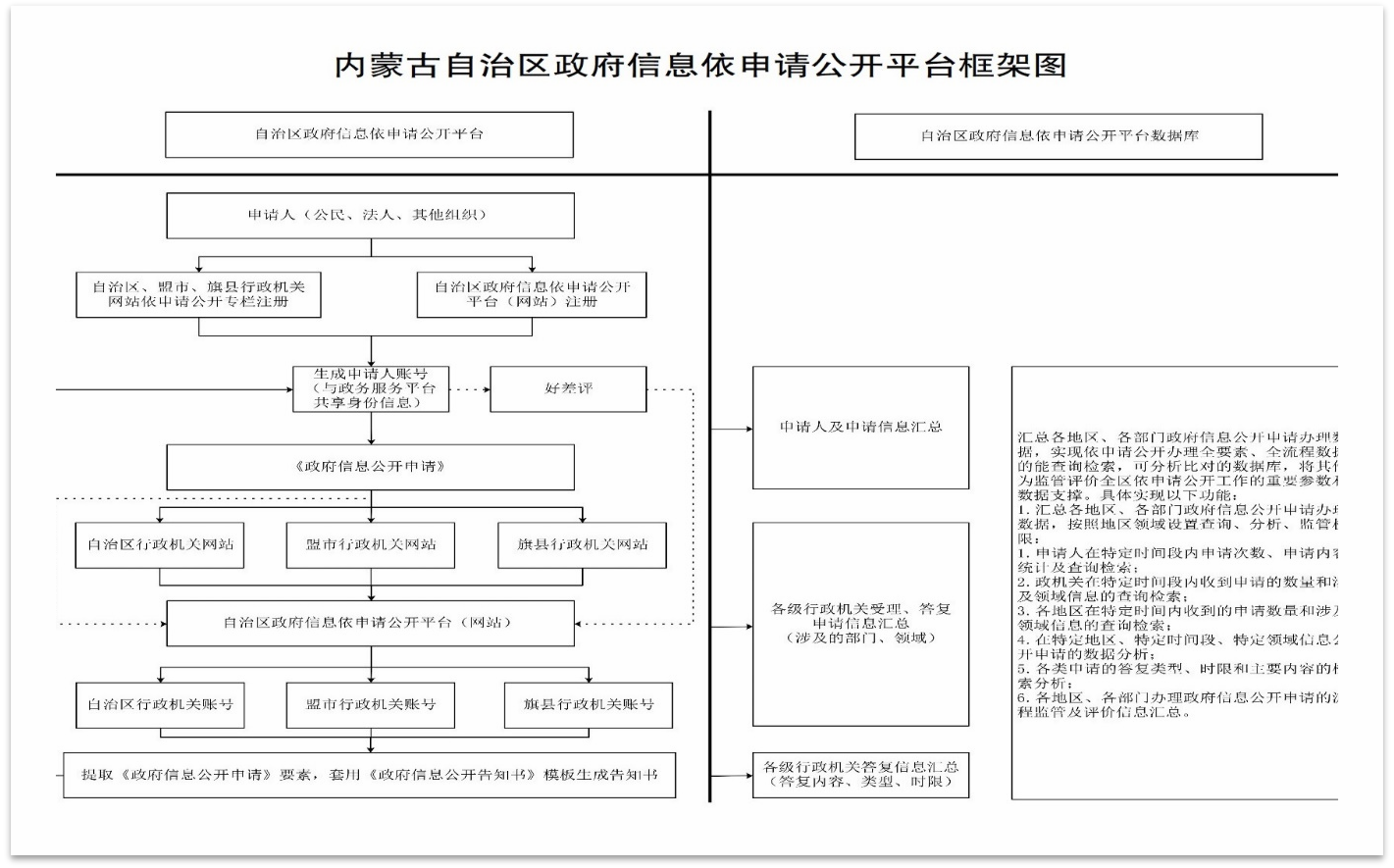 二是提高信息化水平。按照“加强政府信息资源的规范化、标准化、信息化管理,加强互联网政府信息公开平台建设,推进政府信息公开平台与政务服务平台融合,提高政府信息公开在线办理水平”的要求,统筹建设自治区、盟市、旗县(市、区)三级政府信息依申请公开平台,逐步实现“统一文书格式”、“统一系统出件”、“统一数据后台”,通过信息化手段提高政府信息公开申请的办理和监督水平。