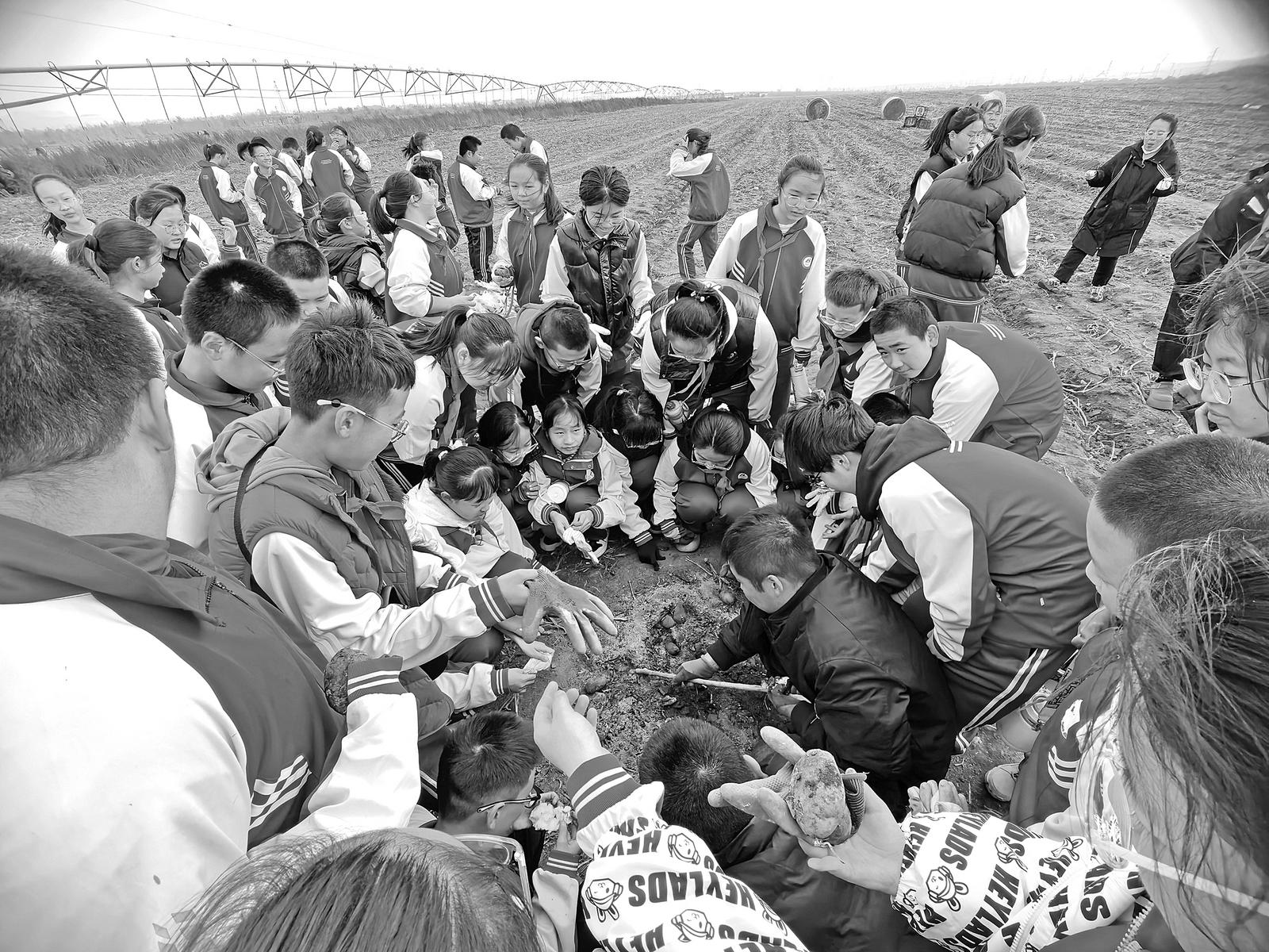 壹蒙壹牧火山民宿的专属马铃薯试验田里,参加研学活动的学生正在挖土豆 受访者 供图