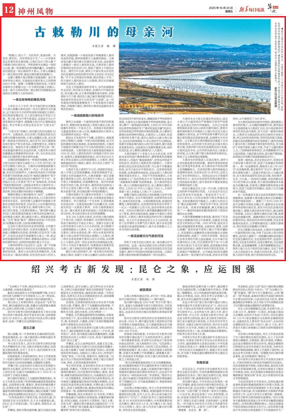 作为古敕勒川的母亲河,大黑河不仅哺育着一方富庶肥沃的土地,孕育了远古的人类文明的曙光,还向世人展现了一部波澜壮阔的各民族交往交流交融的历史:无论是放牧穹庐,还是西口垦荒;无论是兵戎相见,还是出塞和亲;无论是敕勒长歌,还是漫瀚情歌,大黑河都默默地见证了两岸土地上生生不息的交流与融合,见证了各族人民之间血浓于水、休戚与共的关系,见证了各族人民你中有我、我中有你的风俗和文化。 (新华社北京10月25日电 10月24日,《新华每日电讯》)