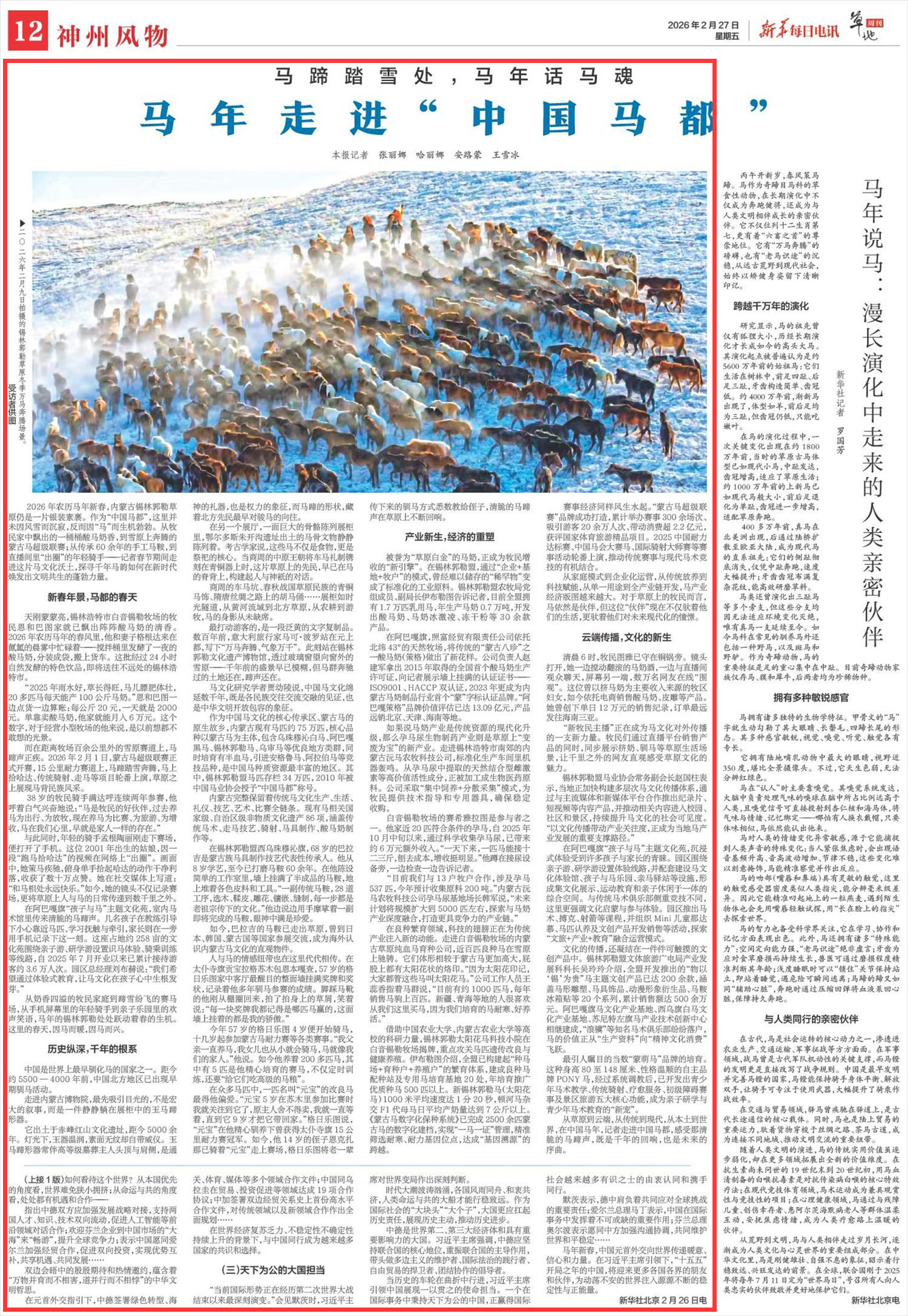 2026年2月27日《新华每日电讯》第12版 2026年农历马年新春,内蒙古锡林郭勒草原仍是一片银装素裹。作为“中国马都”,这里并未因风雪而沉寂,反而因“马”而生机勃勃。从牧民家中飘出的一桶桶酸马奶香,到雪原上奔腾的蒙古马超级联赛;从传承60余年的手工马鞍,到直播间里“出圈”的年轻骑手——记者春节期间走进这片马文化沃土,探寻千年马韵如何在新时代焕发出文明共生的蓬勃力量。新春年景,马都的春天天刚蒙蒙亮,锡林浩特市白音锡勒牧场的牧民恩和巴图家就已飘出阵阵酸马奶的清香。2026年农历马年的春风里,他和妻子格根达来在氤氲的晨雾中忙碌着——搅拌桶里发酵了一夜的酸马奶,分装成袋,搬上货车。这批经过24小时自然发酵的特色饮品,即将送往不远处的锡林浩特市。“2025年雨水好,草长得旺,马儿膘肥体壮,20多匹马每天能产100公斤马奶。”恩和巴图一边点货一边算账:每公斤20元,一天就是2000元。单靠卖酸马奶,他家就能月入6万元。这个数字,对于经营小型牧场的他来说,是以前想都不敢想的光景。而在距离牧场百余公里外的雪原赛道上,马蹄声正疾。2026年2月1日,蒙古马超级联赛正式开赛,15公里耐力赛道上,马蹄踏雪奔腾,马上拾哈达、传统骑射、走马等项目轮番上演,草原之上展现马背民族风采。38岁的牧民骑手满达呼连续两年参赛,他呼着白气兴奋地说:“马是牧民的好伙伴,过去养马为出行、为放牧,现在养马为比赛、为旅游、为增收,马在我们心里,早就是家人一样的存在。”与此同时,年轻的骑手孟根陶丽刚走下赛场,便打开了手机。这位2001年出生的姑娘,因一段“跑马拾哈达”的视频在网络上“出圈”。画面中,她策马疾驰,俯身单手拾起哈达的动作干净利落,收获了数十万点赞。她在社交媒体上写道:“和马相处永远快乐。”如今,她的镜头不仅记录赛场,更将草原上人与马的日常传递到数千里之外。在阿巴嘎旗“孩子与马”主题文化苑,室内马术馆里传来清脆的马蹄声。几名孩子在教练引导下小心靠近马匹、学习抚触与牵引,家长则在一旁用手机记录下这一刻。这座占地约258亩的文化苑围绕亲子游、研学游设置识马体验、骑乘训练等线路,自2025年7月开业以来已累计接待游客约3.6万人次。园区总经理刘布赫说:“我们希望通过体验式教育,让马文化在孩子心中生根发芽。”从奶香四溢的牧民家庭到蹄雪纷飞的赛马场,从手机屏幕里的年轻骑手到亲子乐园里的欢声笑语,马年的锡林郭勒处处跃动着春的生机。这里的春天,因马而暖,因马而兴。历史纵深,千年的根系中国是世界上最早驯化马的国家之一。距今约5500—4000年前,中国北方地区已出现早期驯马活动。走进内蒙古博物院,最先吸引目光的,不是宏大的叙事,而是一件静静躺在展柜中的玉马蹄形器。它出土于赤峰红山文化遗址,距今5000余年。灯光下,玉器温润,素面无纹却自带威仪。玉马蹄形器常伴高等级墓葬主人头顶与肩侧,是通神的礼器,也是权力的象征,而马蹄的形状,藏着北方先民最早对骏马的向往。在另一个展厅,一面巨大的骨骼陈列展柜里,鄂尔多斯朱开沟遗址出土的马骨文物静静陈列着。考古学家说,这些马不仅是食物,更是祭祀的核心。当商周的中原王朝将车马礼制镌刻在青铜器上时,这片草原上的先民,早已在马的脊背上,构建起人与神祇的对话。商周的车马坑、春秋战国草原民族的青铜马饰、隋唐丝绸之路上的胡马俑……展柜如时光隧道,从黄河流域到北方草原,从农耕到游牧,马的身影从未缺席。最打动游客的,是一段泛黄的文字复制品。数百年前,意大利旅行家马可·波罗站在元上都,写下“万马奔腾、气象万千”。此刻站在锡林郭勒文化遗产博物馆,透过玻璃窗望向窗外的雪原——千年前的盛景早已模糊,但马群奔驰过的土地还在,蹄声还在。马文化研究学者贾幼陵说,中国马文化绵延数千年,既是各民族交往交流交融的见证,也是中华文明开放包容的象征。作为中国马文化的核心传承区、蒙古马的原生故乡,内蒙古现有马匹约75万匹,核心品种以蒙古马为主体,包含乌珠穆沁白马、阿巴嘎黑马、锡林郭勒马、乌审马等优良地方类群,同时培育有半血马,引进安格鲁马、阿拉伯马等竞技品种,是中国马种质资源最丰富的地区。其中,锡林郭勒盟马匹存栏34万匹,2010年被中国马业协会授予“中国马都”称号。内蒙古完整保留着传统马文化生产、生活、礼仪、技艺、艺术、比赛全链条。现有马相关国家级、自治区级非物质文化遗产86项,涵盖传统马术、走马技艺、骑射、马具制作、酸马奶制作等。在锡林郭勒盟西乌珠穆沁旗,68岁的巴拉吉是蒙古族马具制作技艺代表性传承人。他从8岁学艺,至今已打磨马鞍60余年。在他陈设简单的工作室里,墙上挂满了半成品的马鞍,地上堆着各色皮料和工具。“一副传统马鞍,28道工序,选木、鞣皮、雕花、镶嵌、缝制,每一步都是老祖宗传下的文化。”他边说边用手摩挲着一副即将完成的马鞍,眼神中满是珍爱。如今,巴拉吉的马鞍已走出草原,曾到日本、韩国、蒙古国等国家参展交流,成为海外认识内蒙古马文化的直观物件。人与马的情感纽带也在这里代代相传。在太仆寺旗贡宝拉格苏木包恩本嘎查,57岁的格日乐图家中客厅最醒目的整面墙挂满奖牌和奖状,记录着他多年驯马参赛的成绩。脚踩马靴的他刚从棚圈回来,拍了拍身上的草屑,