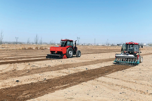 春分节气刚过,巴彦淖尔市临河区干召庙镇黄济村的田野上,一派繁忙的春播景象。播种机来回穿梭,整地、播种、磨地等作业一气呵成。
