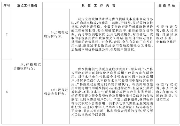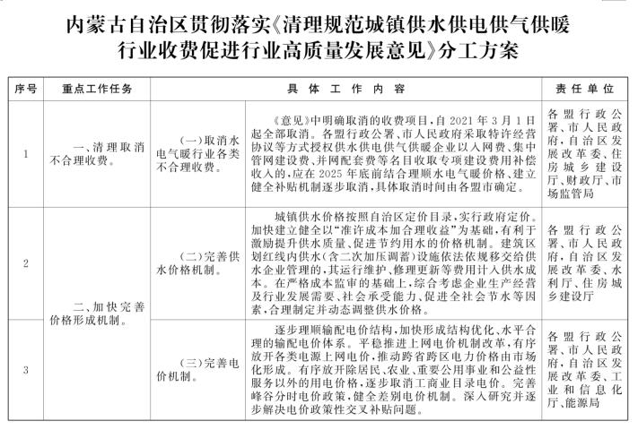 经自治区人民政府同意,现将《内蒙古自治区贯彻落实〈关于清理规范城镇供水供电供气供暖行业收费促进行业高质量发展的意见〉分工方案》印发给你们,并提出以下意见,请一并贯彻落实。